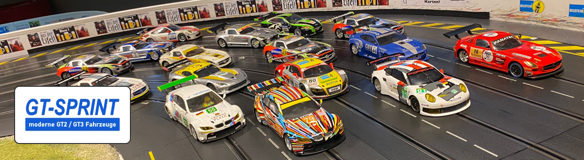 Die Rennserie GT-SPRINT fahren wir seit 2014 mit einer Unterbrechung während der Corona Krise. Eine Rennserie für moderne GT2 und GT3 Fahrzeuge mit Scaleauto Karosserien und DoSlot Chassis. Karosserie und Chassis werden an den Originalzapfen verschraubt. Eine BoP durch Gewichte bei den Karosserien, Einheitschassis, ausgegebenen Rädern und Motoren ermöglichen einen fairen Rennabend. Gaststarter sind jederzeit herzlich willkommen.